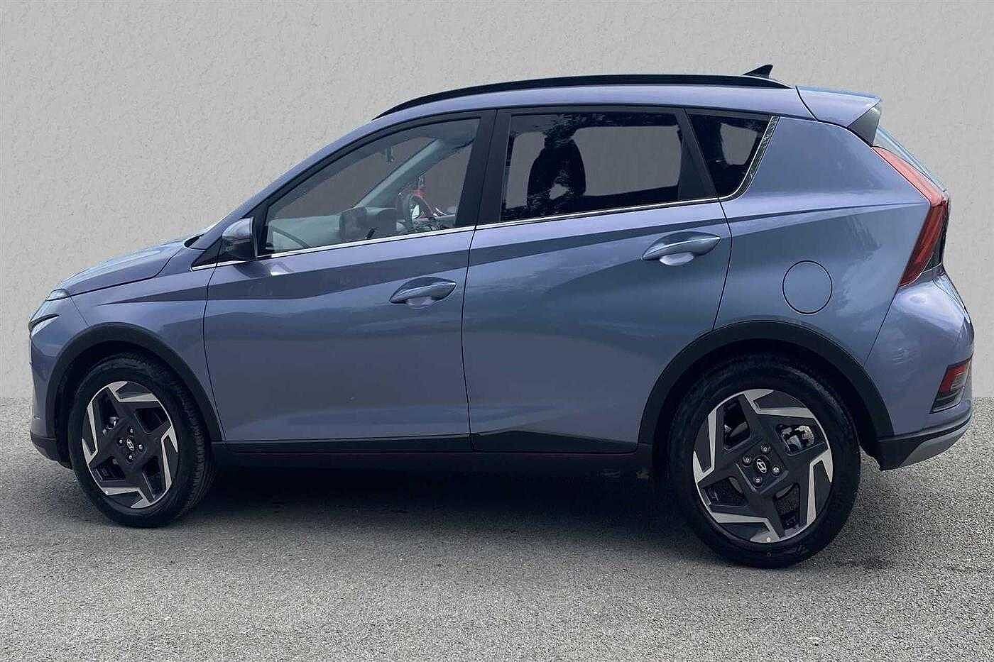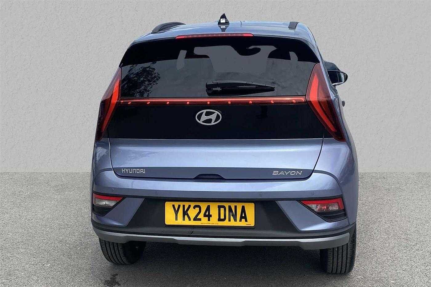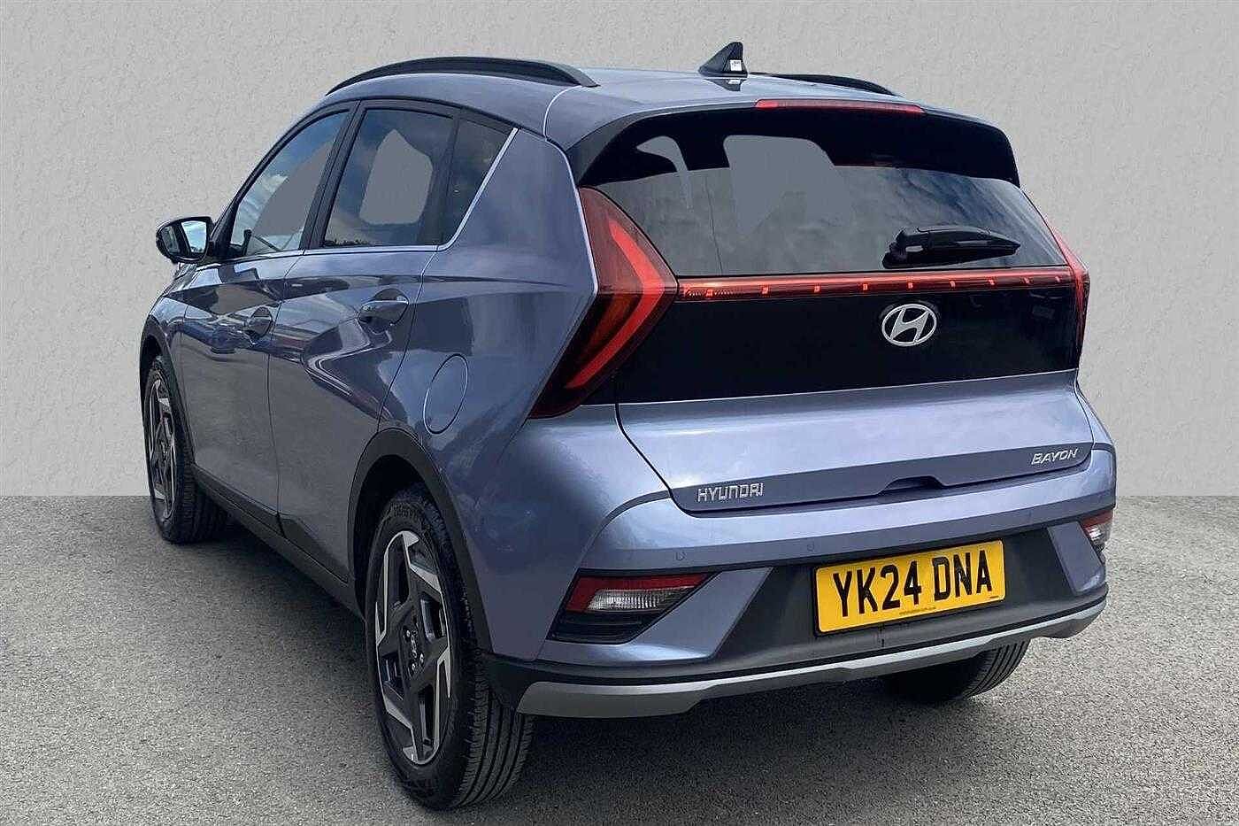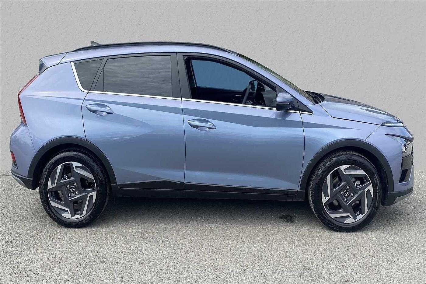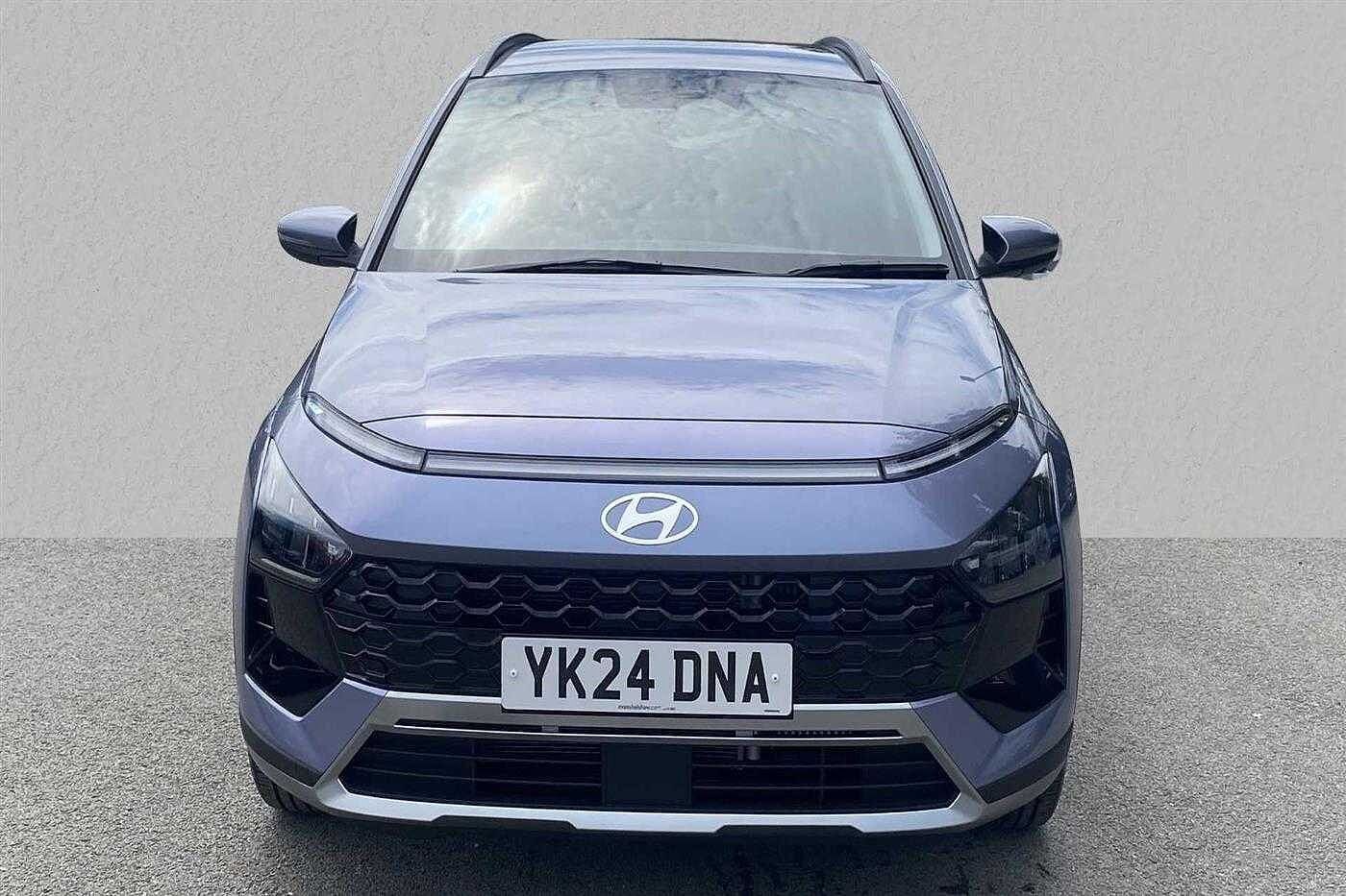 Hyundai BAYON 1.0 T-GDi (100ps) Premium 48 Volt MHEV DCT finished in Pearl - Intense blue with matching interior. Specification includes anti-lock brakes, climate control, power-assisted steering, alloy wheels (17in), cruise control, satellite navigation, in car entertainment (radio), immobiliser, mirrors external (electric heated/folding), front fog lights, rear wash/wipe (rear), armrest (front), adjustable steering column/wheel (rake/reach), air bag driver, air bag passenger, alarm (perimetric), body coloured bumpers, central door locking (remote), centre rear seat belt, child locks (manual), dab radio, deadlocks, electric windows (front/rear), electronic brake force distribution, electronic stability programme, exterior cornering lighting (exterior cornering li, gear knob leather, head light sensor (head light sensor), head restraints (front/rear), heated rear screen, interior finishes, mirrors internal (automatic dimming rear view), parking aid (rear parking camera), power socket (front), rear spoiler, roof rails, safety system (lane control assistant), seat - isofix anchorage point (two seats - rear), seat belt pre-tensioners (front), seat height adjustment (driver), seats heated (driver/passenger), seats split rear, steering wheel heated, steering wheel leather, steering wheel mounted controls (audio/telephone), sun visor, tele aid, telephone equipment (bluetooth interface), third brake light, tinted glass (front), trip computer, tyre pressure control, tyre repair kit, voice activated controls and windscreen wiper (front).