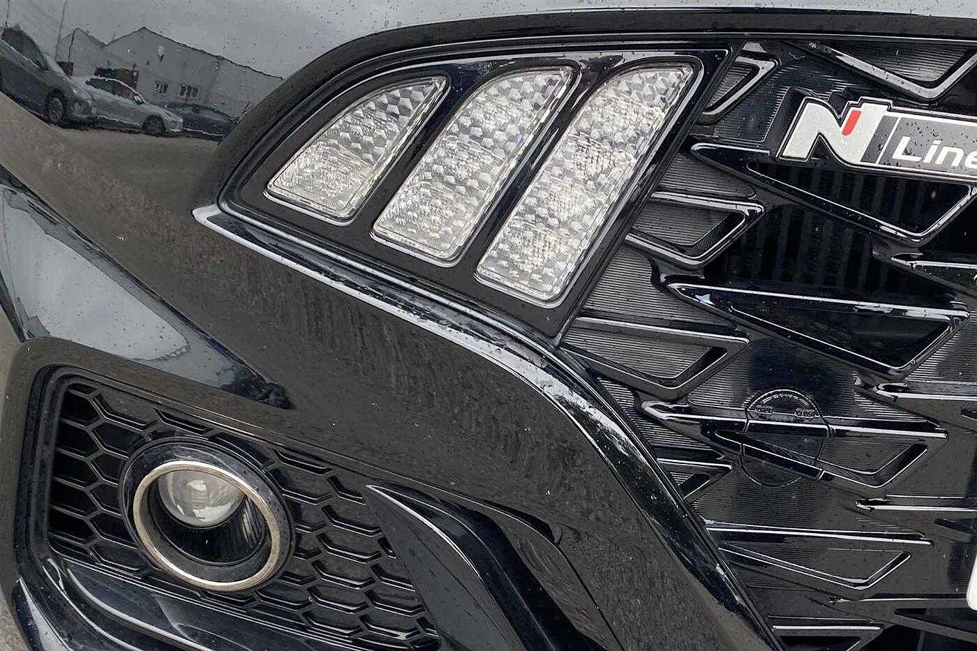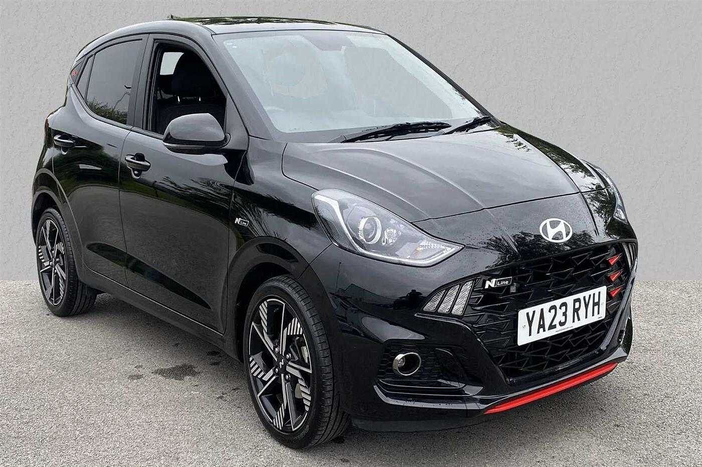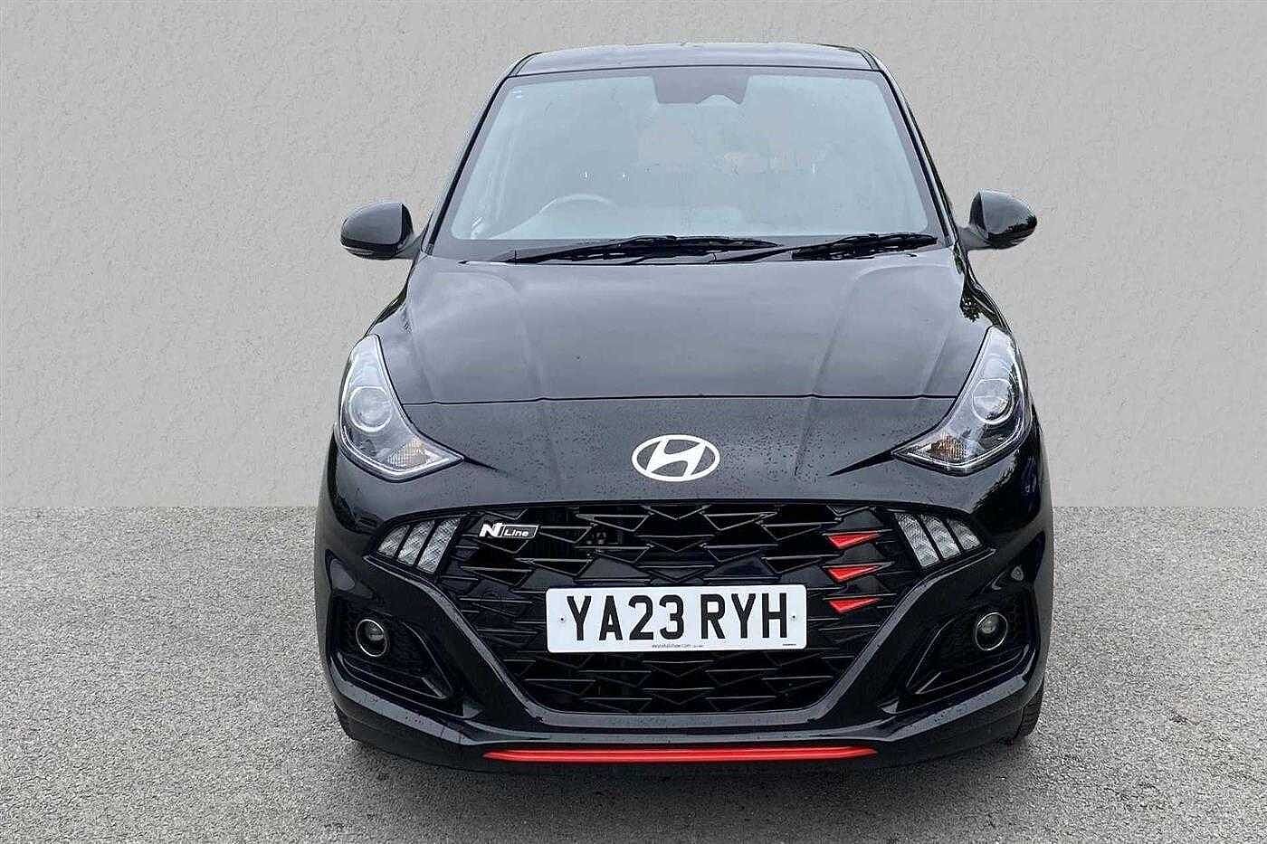Hyundai i10 1.0 T-GDi (100ps) N Line 5 Door finished in Phantom Black with black cloth matching interior. Specification includes anti-lock brakes, climate control, air conditioning., power-assisted steering, airbags., alloy wheels (16in), cruise control, satellite navigation., touch screen monitor (touch screen monitor), tinted glass (rear windows), mirrors external (electric/heated), immobiliser, front fog lights, rear wash/wipe (rear), electric windows., power steering, adjustable steering column/wheel (rake), air bag driver, air bag passenger, air bag side (front side/front & rear curtain), alarm (perimetric), automatic lights, bluetooth, body coloured bumpers, central door locking (remote), centre rear seat belt, child locks (manual), computer (driver information system), cup holder, dab digital radio, electric windows (front/rear), electronic brake force distribution, electronic stability programme, exterior lighting (daytime running lights), exterior wrap (exterior wrap), extra storage, floor mats, gear knob leather, head restraints (front/rear), heated rear screen, interior finishes, isofix, key (keyless entry), parking aid (rear parking camera), power socket (front), rear parking sensors, reversing camera, roof spoiler, safety system (lane control assistant), seat - isofix anchorage point (two seats - rear), seat belt pre-tensioners (front), seats heated (driver/passenger), seats split rear, start/stop system (start/stop system), steering wheel heated, steering wheel leather, steering wheel mounted controls (audio/telephone), tele aid, third brake light, towing equipment (rear), trip computer, tyre pressure control, tyre repair kit, usb connectivity, voice activated controls and windscreen wiper (front).