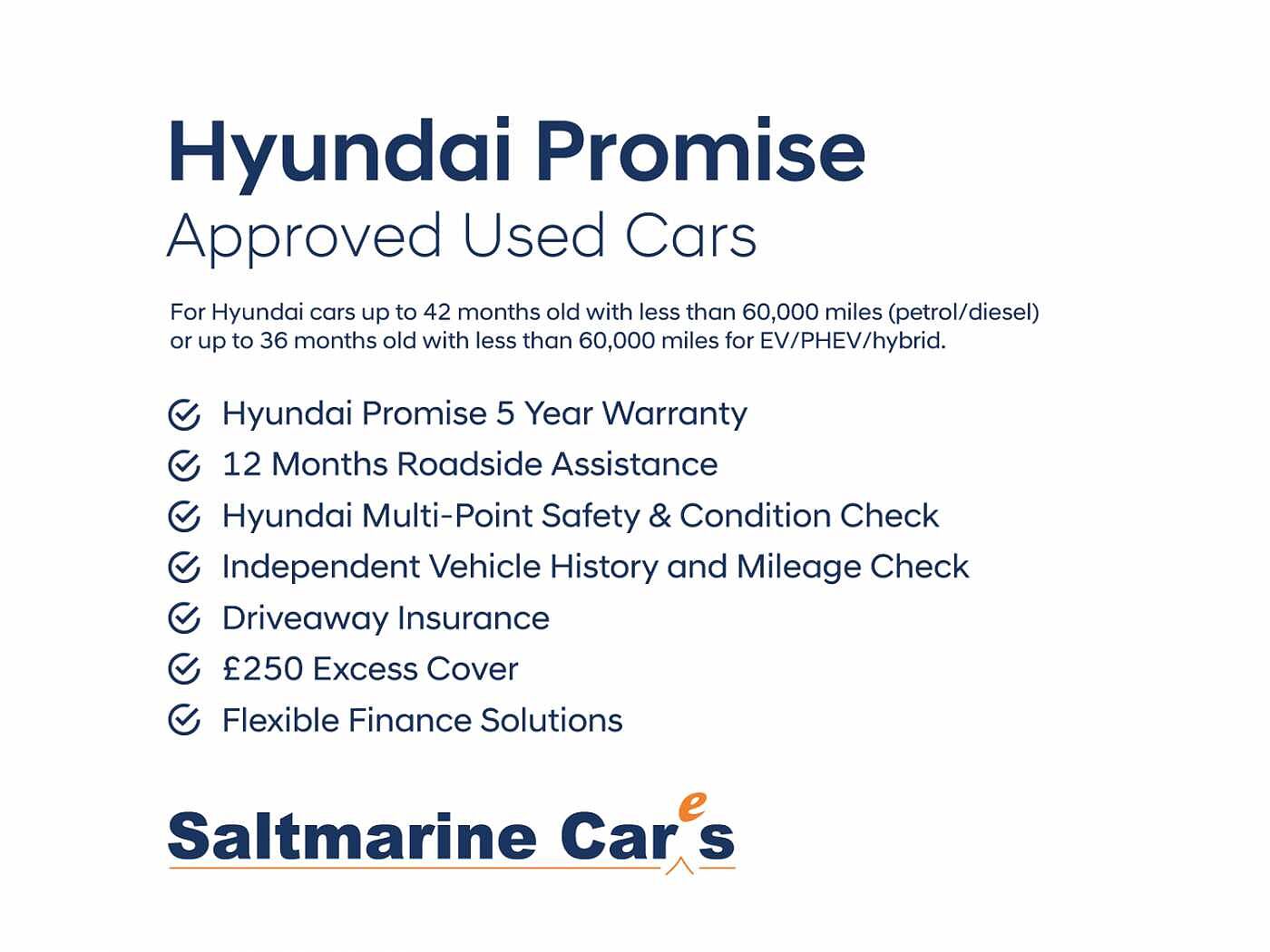 Hyundai Promise cars come with a minimum of 24 months Hyundai warranty, that can be upgraded to a 5-years Hyundai warranty (at additional cost, contact your retailer for further information). To be classified as a Hyundai Promise car, the Hyundai car must have less than 60,000 miles on the clock or be no older than 36 months old.