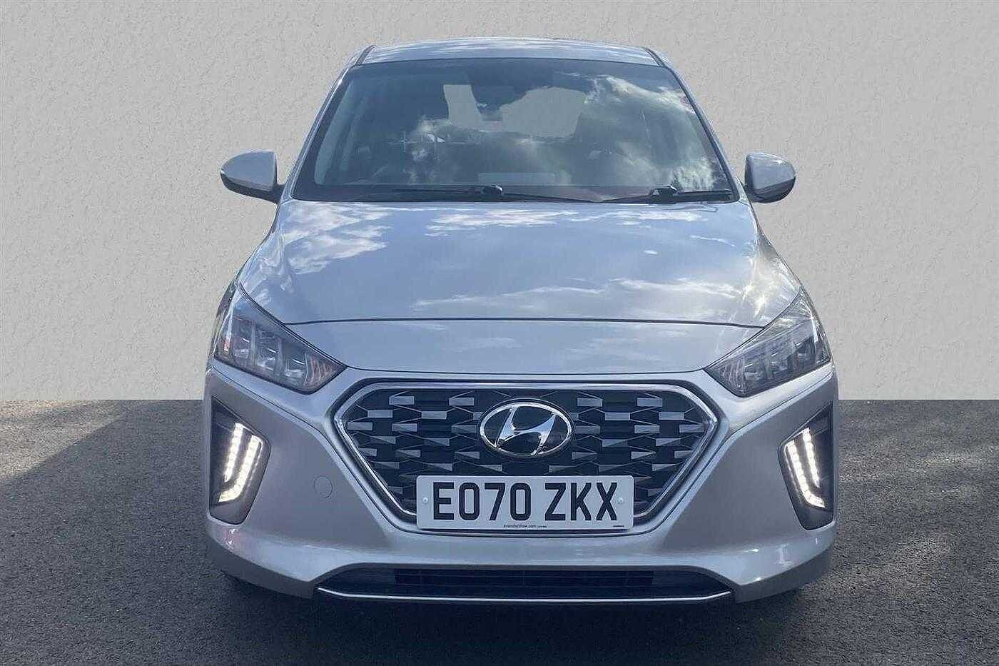 Hyundai IONIQ 1.6 GDi (105ps) Premium Plug-in Hybrid finished in Shimmering Silver with black cloth matching interior. Specification includes anti-lock brakes, climate control, air conditioning., power-assisted steering, airbags., alloy wheels (16in), cruise control, satellite navigation, computer, in car entertainment (radio), immobiliser, mirrors external (electric heated/folding), armrest (front), electric windows., power steering, air bag driver, air bag passenger, air bag side (front side & front curtain), automatic lights, bluetooth, body coloured bumpers, cargo space divider, central door locking (remote), centre rear seat belt, dab radio, deadlocks, electric windows (front/rear), electronic brake force distribution, electronic stability programme, exterior lighting (bi-xenon headlights), head restraints (front/rear), heated rear screen, isofix, key (keyless entry), mirrors internal (automatic dimming rear view), on-board monitor (unspecified), parking aid (rear parking camera), rear parking sensors, rear spoiler, reversing camera, seat height adjustment (driver/passenger), seat lumbar support (driver electric), seats heated (driver/passenger), seats split rear, side protection mouldings, sound processor (amplifier), speed limiter., steering wheel heated, steering wheel leather, steering wheel mounted controls (audio/cruise cont, sun visor, tele aid, third brake light, trafficmaster, tyre pressure control, tyre repair kit, usb connectivity and windscreen shadeband.