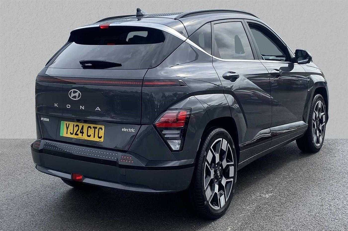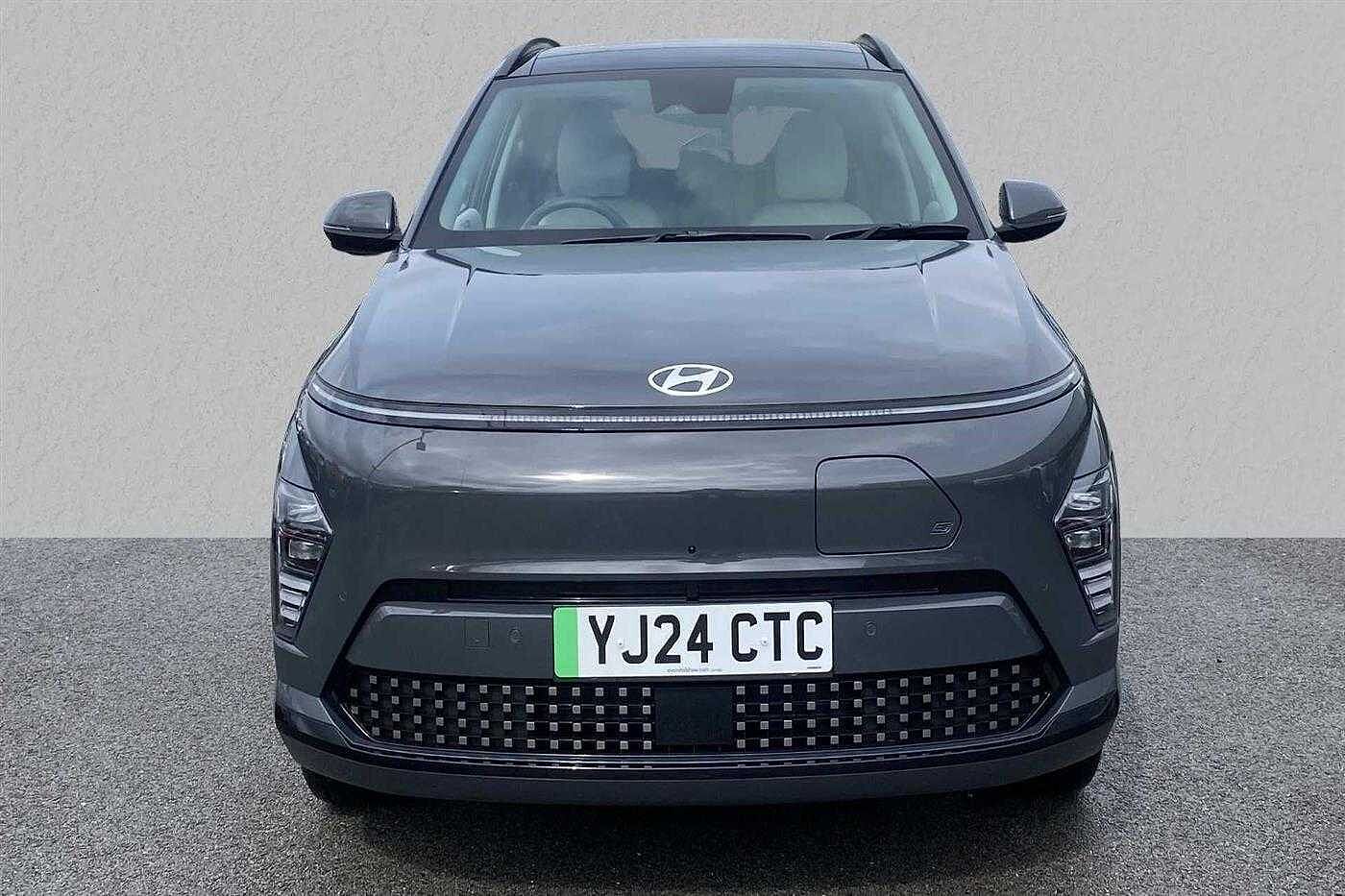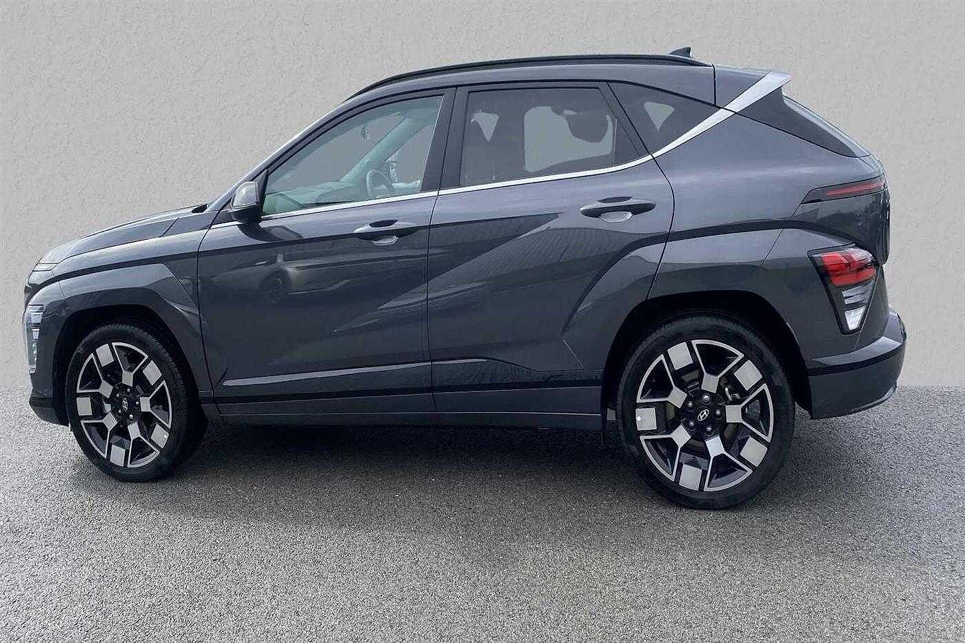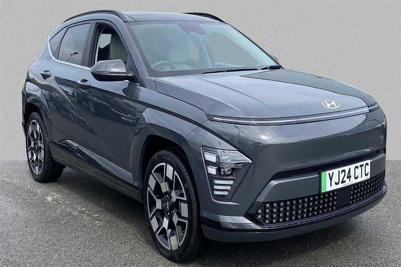 Hyundai KONA E (218ps) Ultimate finished in Pearl - Ecotronic grey with matching interior. Specification includes anti-lock brakes, climate control, power-assisted steering, alloy wheels (19in), cruise control, satellite navigation, computer, touch screen monitor (touch screen monitor), immobiliser, mirrors external (electric heated/folding), rear wash/wipe (rear), rain sensor, adjustable steering column/wheel (rake/reach), air bag driver, air bag passenger, air bag side (front side & front curtain), alarm, blind spot assist (blind spot assist), body coloured bumpers, central door locking (remote), centre rear seat belt, comfort ventilated front seats, dab radio, electric parking brake (electric parking brake), electric windows (front/rear), electronic brake force distribution, electronic stability programme, exterior lighting (led daytime running lights), exterior wrap (exterior wrap), extra storage, gear knob leather, head light sensor (head light sensor), head restraints (front/rear), heated front screen, heated rear screen, hill descent control, hill holder, interior finishes, keyless start (keyless start), load anchorage points, mirrors internal (automatic dimming rear view), on-board monitor (head up display), parking aid (front/rear camera), rear spoiler, remote hatch opener (remote hatch opener), roof rails, seat belt pre-tensioners (front/rear), seat height adjustment (electric driver/passenger), seat lumbar support (driver), seats heated (front/rear), seats split rear, sound processor (amplifier), steering wheel leather, steering wheel mounted controls (audio/cruise cont, sun visor, sunroof electric (glass), tailgate window (electric), telephone equipment (bluetooth interface), third brake light, tinted glass, towing equipment (rear), tyre pressure control, tyre repair kit and voice activated controls.